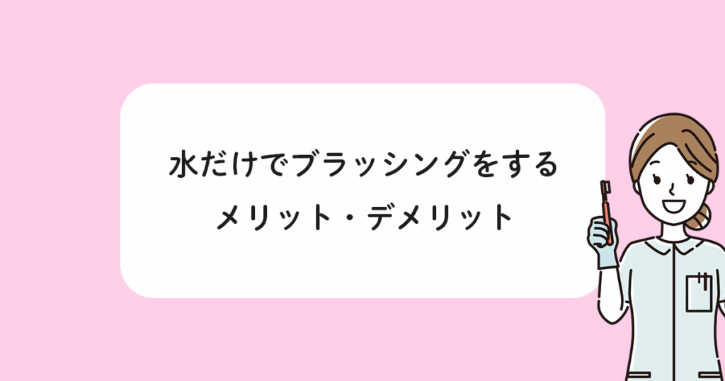 ブラッシングをするときは、ほとんどの方が歯ブラシと歯磨き粉を使用しているかと思います。 しかし、歯磨き粉をつけずに水のみでブラッシングをするという方も、意外と多くいます。 今回は、水だけでブラッシングをすることのメリットとデメリットについて解説します。 水だけでブラッシングをするメリット 水と歯ブラシだけでブラッシングをするメリットとしては、主に以下のことが挙げられます。 ・刺激が少ない ・汚れが見えやすい ・手軽 各メリットについて詳しく説明します。 刺激が少ない 歯磨き粉を使用せず水だけでブラッシングすれば、口内の刺激は必然的に少なくなります。 歯磨き粉には、研磨剤や発泡剤などさまざまな成分が含まれています。 研磨剤は文字通り歯を研磨する成分で、発泡剤は泡立てる役割があります。 これらの刺激が苦手な方にとって、水だけでブラッシングすることは刺激が少なく、口内環境に優しい選択肢となります。 汚れが見えやすい 水だけでブラッシングをする場合、歯に付着した汚れが見えやすくなります。 こちらは発泡剤の影響を受けないからです。 発泡剤で口内が泡立つことにより、爽快感を得ることができますが、泡の量が多すぎると食べカスやプラークを視認しにくくなります。 その結果、磨き残しが出てしまうことにつながります。 その点、水だけであれば歯に付着した汚れをしっかり見ながら落とせるため、磨き残しのリスクは軽減されます。 手軽 単純に手軽だという点も、水だけでブラッシングすることのメリットです。 歯磨き粉を必要としないため、外出先や旅行先など、歯磨き粉を持ち歩けない状況でも手軽に歯を磨くことができます。 また歯ブラシに歯磨き粉をつけるという手間を省くことができるため、これまでよりも頻繁にブラッシングをするきっかけになるかもしれません。 水だけでブラッシングをするデメリット 水だけでブラッシングする方法には以下のデメリットもあるため、注意してください。 ・プラーク除去効果が低い ・虫歯、歯周病予防効果が低い ・口臭予防効果が低い ・着色汚れを落とすのが難しい 各デメリットについて詳しく説明します。 プラーク除去効果が低い 歯磨き粉を使用せず、水だけで磨く場合、汚れを見ながら落としやすいという話をしました。 しかし、歯磨き粉に含まれているプラーク除去効果のある成分の恩恵を受けられないため、実際はそこまで飛躍的に除去効果が向上するわけではありません。 確かに、目に見える部分のプラークは落としやすいですが、前歯の裏や奥歯など見えにくい部分は汚れが残ってしまう可能性があります。 また見えにくい部分は、虫歯を発症していてもなかなか気付けないことが考えられます。 虫歯、歯周病予防効果が低い 虫歯や歯周病予防効果が低い点も、水だけでブラッシングをすることのデメリットです。 歯磨き粉に含まれるフッ素などの成分は、歯を強くし、虫歯を予防する効果があります。 水だけで磨く場合、これらの成分を摂取できないため、虫歯予防効果が期待できません。 さらに、殺菌作用などがある成分の効果も得られないため、歯周病のリスクも高まってしまいます。 口臭予防効果が低い 口臭が気になる方は、水だけでブラッシングをするべきではありません。 なぜなら、水だけの場合、プラークを除去できたとしても口臭予防効果は下がってしまうからです。 歯磨き粉には、口臭の原因となる菌を殺菌したり、口臭をマスキングして目立ちにくくしたりする成分が含まれています。 そのため、ある程度ニオイを軽減させられます。 水だけの場合、そこまで口臭の軽減効果は得られないため、自身だけでなく周りの方にも迷惑をかけてしまう可能性があります。 本人は自身の口臭に慣れるのが早いため、ニオイが出ていてもそれほど気になりませんが、周りの方はかなり離れていても口臭がしていることがわかります。 着色汚れを落とすのが難しい 水だけで行うブラッシングには、着色汚れを落とすのが難しいというデメリットもあります。 歯の表面に付着したコーヒーや赤ワインなどの着色汚れは、歯磨き粉に含まれる研磨剤によって除去されます。 また歯磨き粉の中には、ホワイトニング歯磨き粉という着色汚れを除去するのに特化したものも存在します。 水だけで磨く場合、汚れは落とせても着色汚れまで落とすのは難しいです。 いわば洗剤をつけず、汚れてしまった食器を洗っているようなものです。 もちろん、着色汚れを落とせないということは、水だけでブラッシングしている以上、どんどん歯は黄ばんでいくということになります。 特にコーヒーや赤ワイン、ケチャップやカレーなど色の濃いものを頻繫に摂取する方は注意が必要です。 まとめ ブラッシングは回数ではなく、1回1回の質を大切にしなければいけません。 そのため、基本的には歯磨き粉をつけて磨くようにしましょう。 水だけで行っても良いのは、あくまで